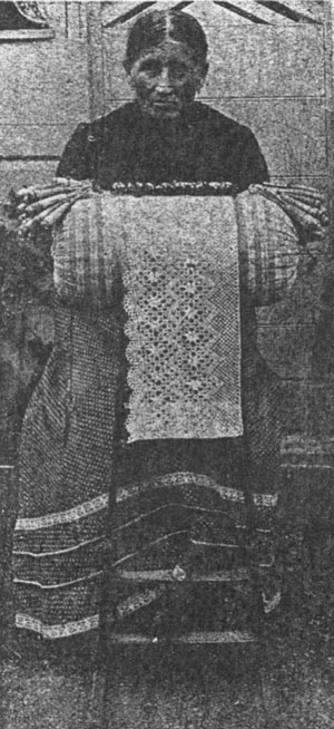 In ihrem stillen Heim in Wiesa betreibt die 81 Jahre alte würdige Vertreterin der erzgebirgischen Spitzenklöppelei, Frau Christiane Mann, in schaffensfrohem Fleiße ihre kunstvolle Handfertigkeit.